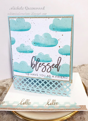 I used Altenew Inks for two tone RAH clouds on a small 4x4 piece of white card stock. I ultimately mounted it on to some MFT gold sparkle card stock and finally on to a piece of PTI Aqua Mist card stock. Once I used the border punch; I added a small piece of gold sparkle card stock to the inside to show through when the card is closed. I embossed the sentiment from RAH Script Greetings in Ranger Liquid Platinum; I then splattered some gold paint on the panel to finish if off.